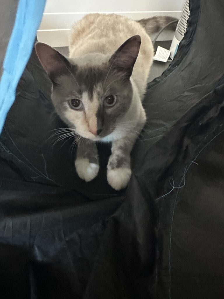 She sleeps. A lot. Usually in the laundry hamper or inside the lining of my couch. When she’s not sleeping, she destroys my things. Curtains and chairs are her favorite objects to claw. Luna likes sinks, and water (up to a point, and then she gets mad). She’s not super smart, but she’s very funny.